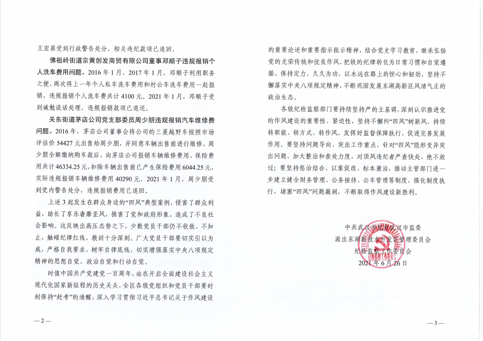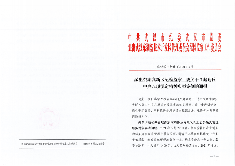 派出東湖高新區(qū)紀(jì)檢監(jiān)察工委關(guān)于3起違反中央八項規(guī)定精神典型案例的通報