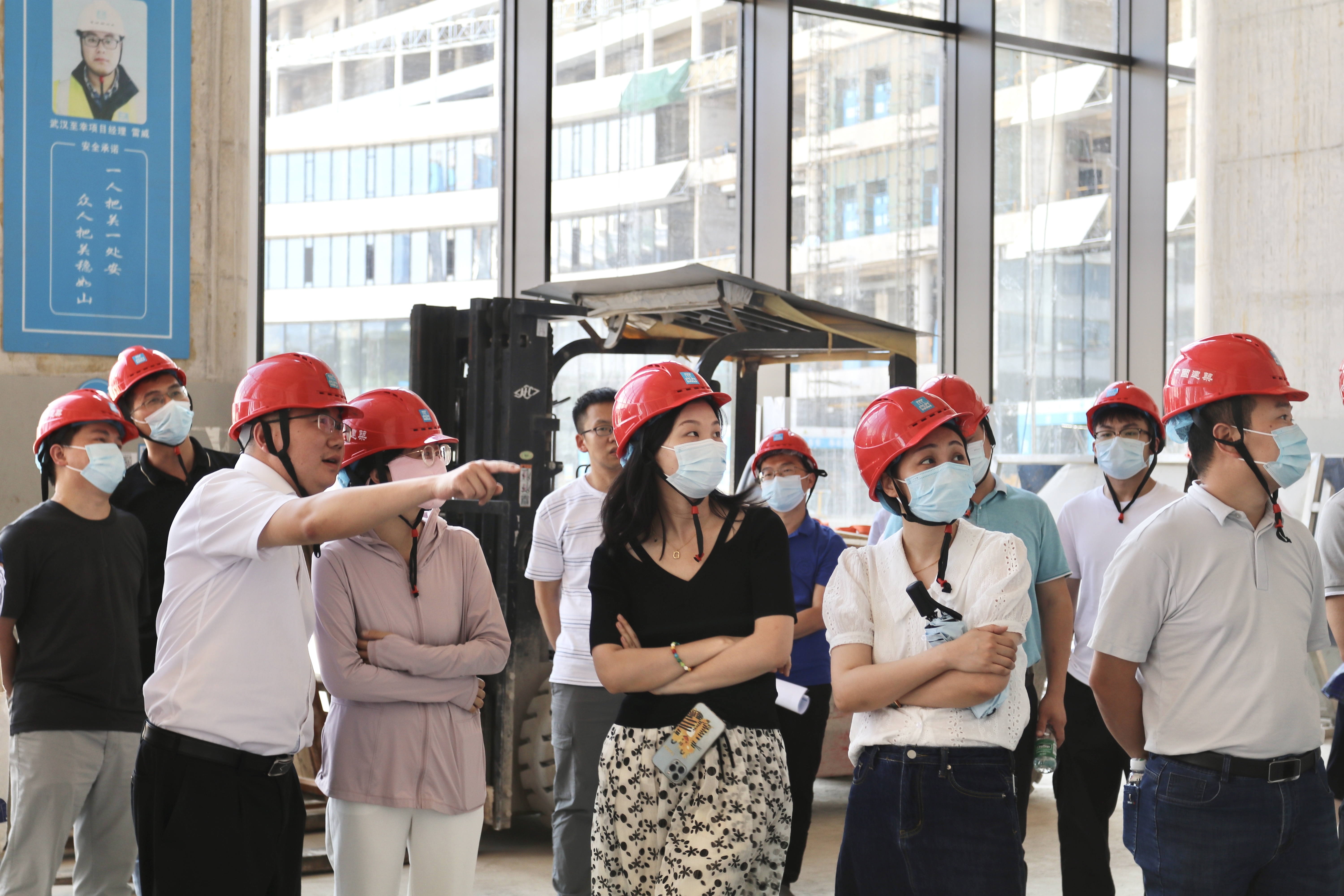 深入項目現(xiàn)場,大家實地參觀學(xué)習(xí)了塔樓的新媒體傳播中心以及裙樓新媒體制作中心,了解了該項目鋼骨柱、勁性桁架、懸挑桁架、屋面桁架等復(fù)雜的鋼結(jié)構(gòu)設(shè)計以及超大跨度桁架、大懸挑疊層桁架、超高模板架體以及滿足傳媒特殊要求的浮筑地面、重墻等行業(yè)領(lǐng)先工藝,還有優(yōu)秀的室內(nèi)裝飾、綠化等理念。